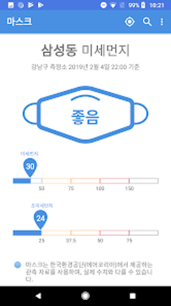 Denna app ger den andra fina dammstatusen för varje plats i Korea baserat på Världshälsoorganisationens (WHO) riktlinjer.